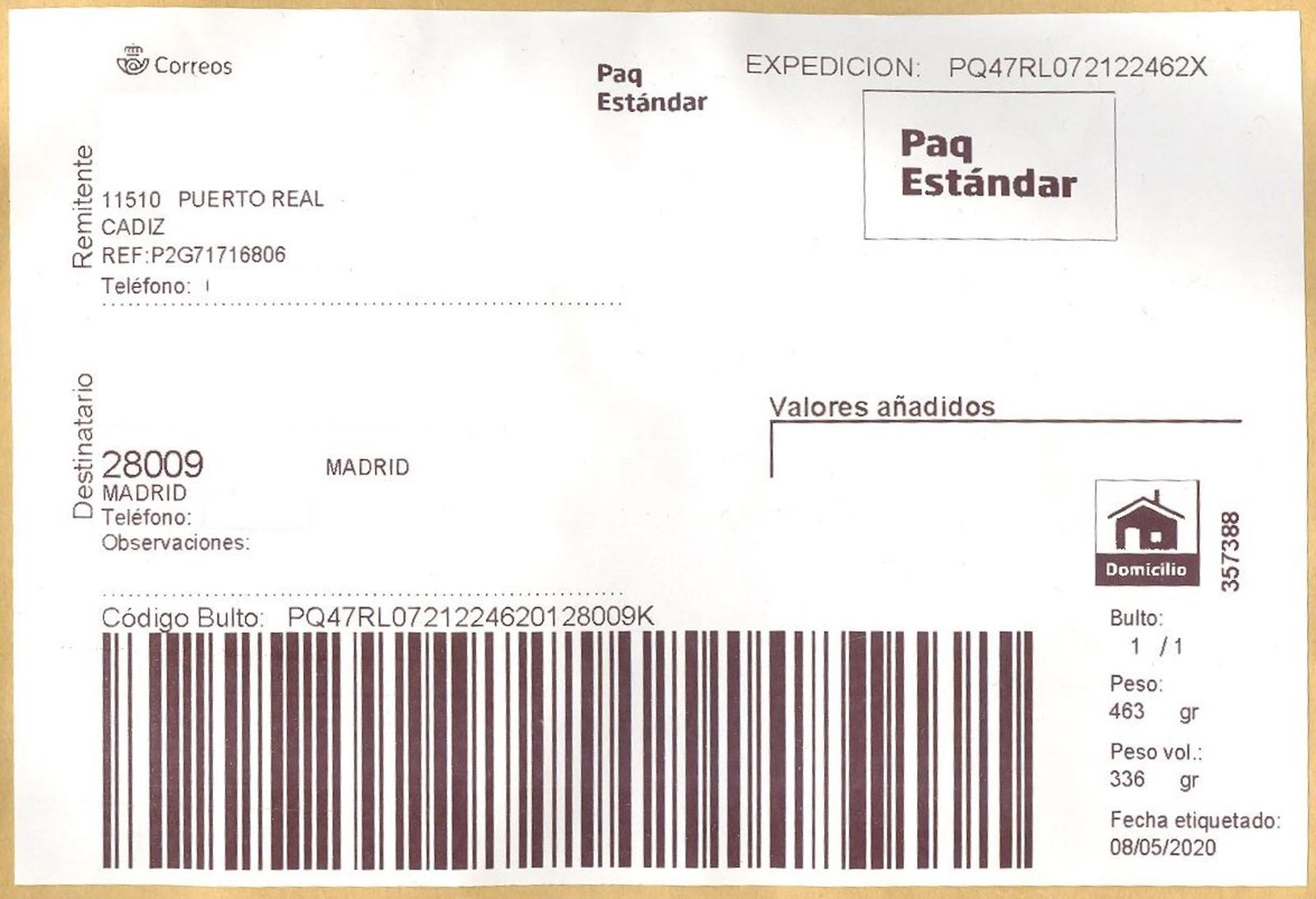 Etiqueta Grande. Nuevo Correos. Paq Estándar. No indica (Puerto Real, sin precisar). 357388. Domicilio. Sin franqueo. 10x14,7. 2020-05-08. Baja.jpg