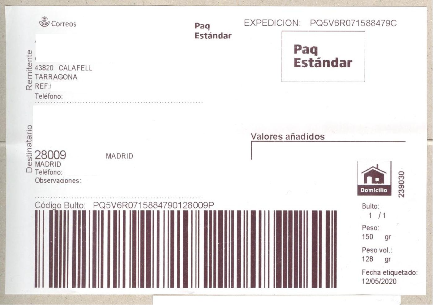 Etiqueta Grande. Nuevo Correos. Paq Estándar. No indica (Calafell, sin precisar). 239030. Domicilio. Sin franqueo. 10x14,8. 2020-05-12. Baja.jpg