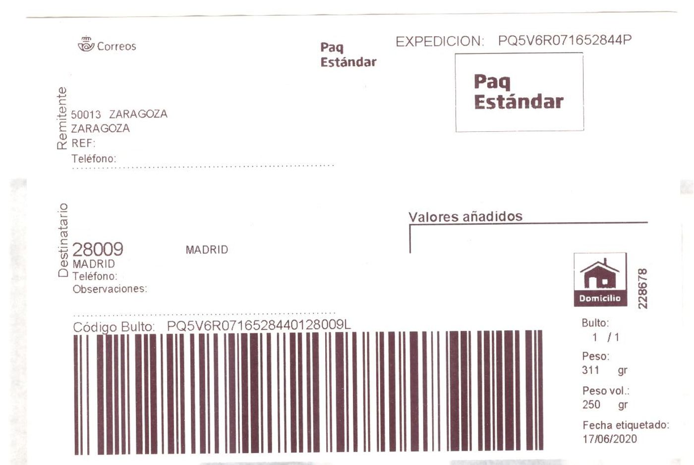Etiqueta Grande. Nuevo Correos. Paq Estándar. No indica (Zaragoza, sin precisar). 228678. Domicilio. Sin franqueo. 10x14,7. 2020-06-17. Baja.jpg