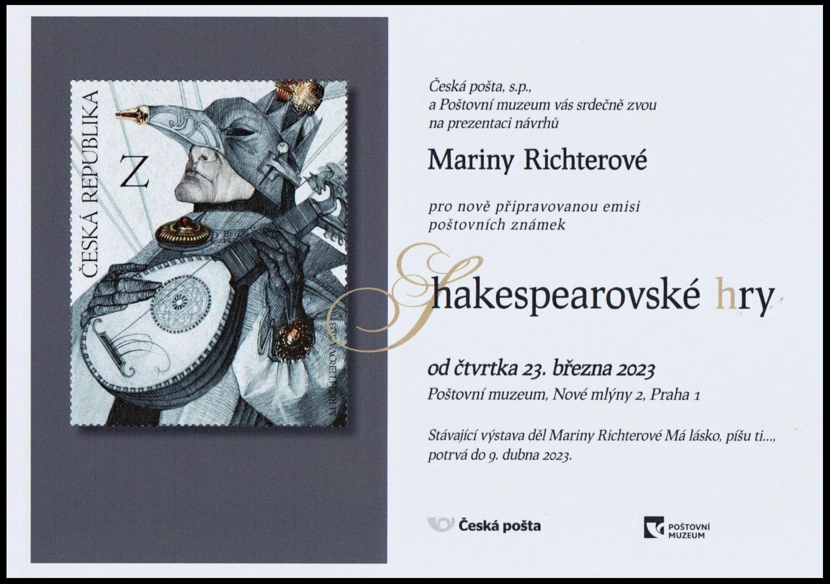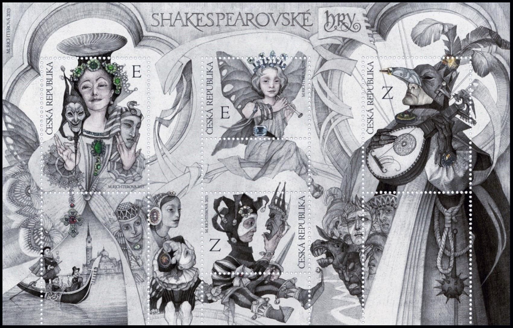 Y por otra parte, se confirma el diseño final de los sellos checos de Shakespeare que salen en 3 semanas. Aquí debajo está la imagen publicitaria del Correo checo de la hojita creada por Marina Richterová. Poco que decir que no hayamos dicho ya. Es otro mundo, es otro nivel.