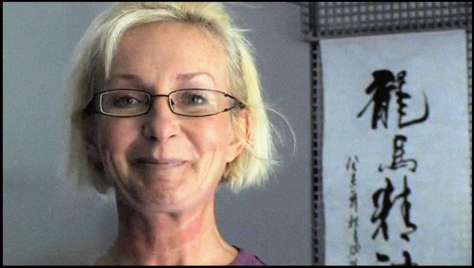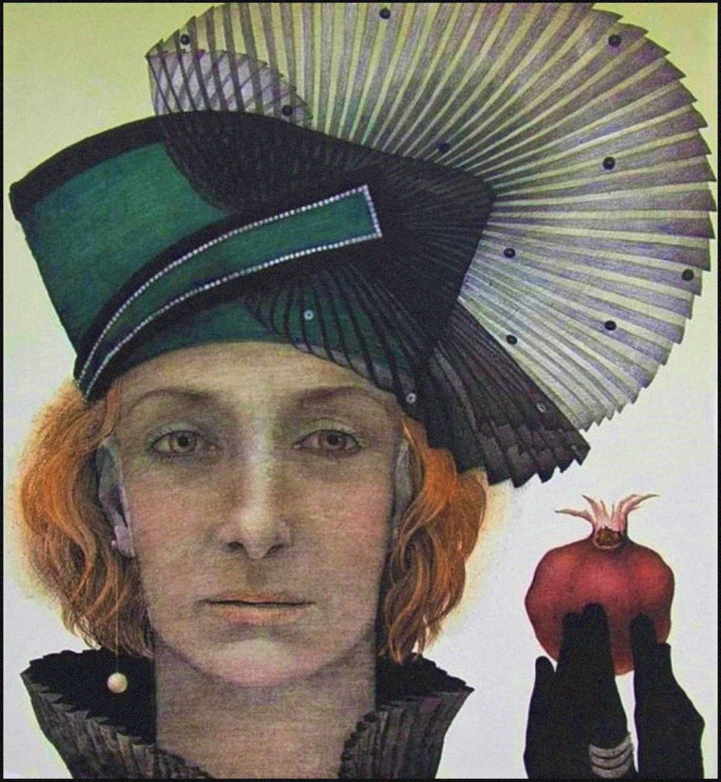 Y la primera que al menos yo doy por seguro es el autorretrato taimado de la propia artista en la hojita. Lo he marcado con un círculo y está ampliado en la imagen siguiente. Además y como bien puede verse, Richetrová tiene una pluma de tinta en la mano, quizá utilizada por la artista en la confección del dibujo original. Pongo como tercera imagen un autorretrato declarado de Marina Richterová para confirmar el parecido, por si con la fotografía antes expuesta no fuera patente.