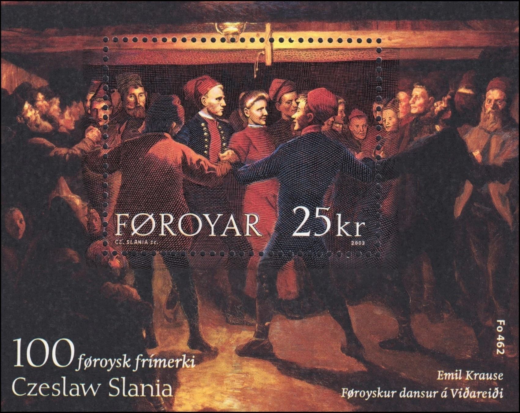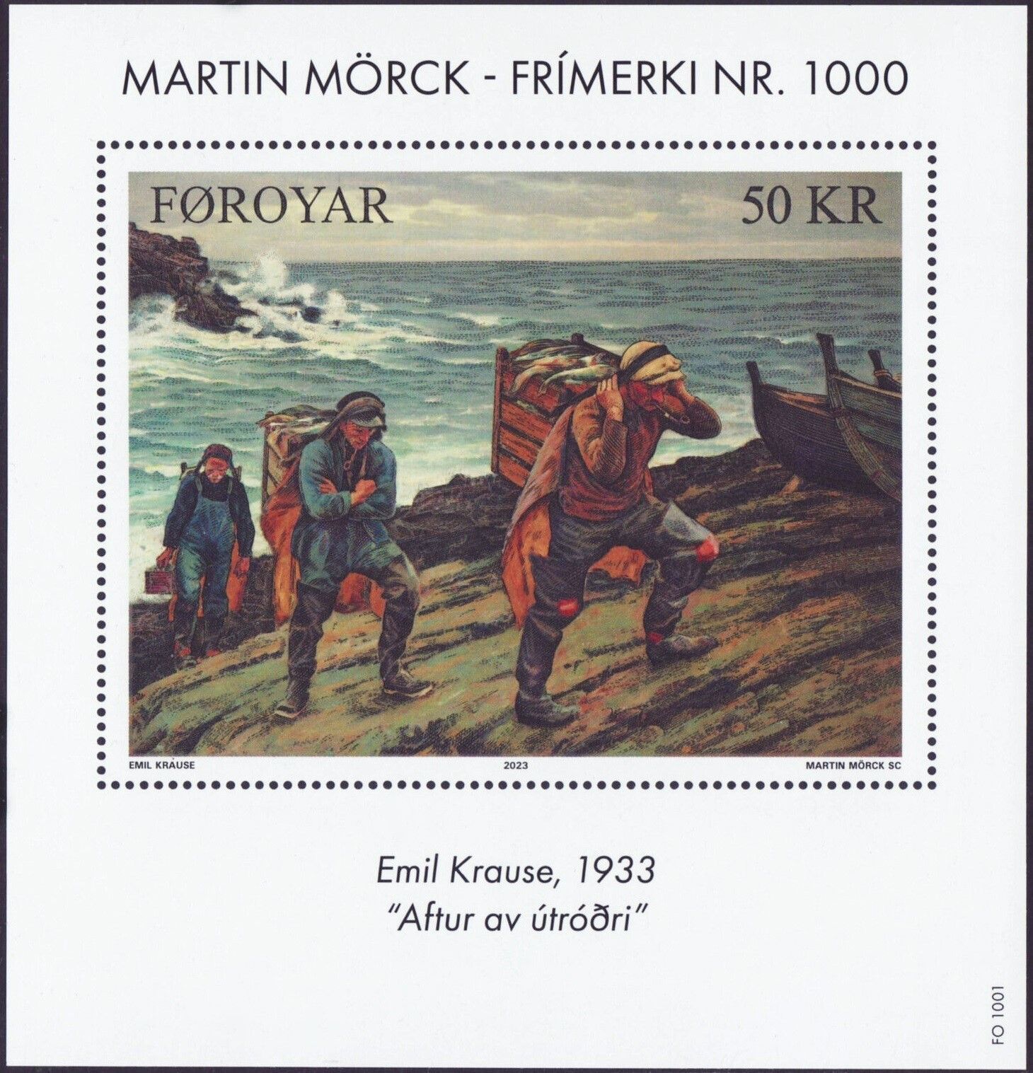 Por otra parte, el artista del que Mörck graba la pintura en este su sello 1000, Emil Krause (Regresando de pescar), es el mismo sobre el que Slania grabó su sello número 100 para Islas Feroe (2003). Ponemos aquí debajo una y otra emisión.