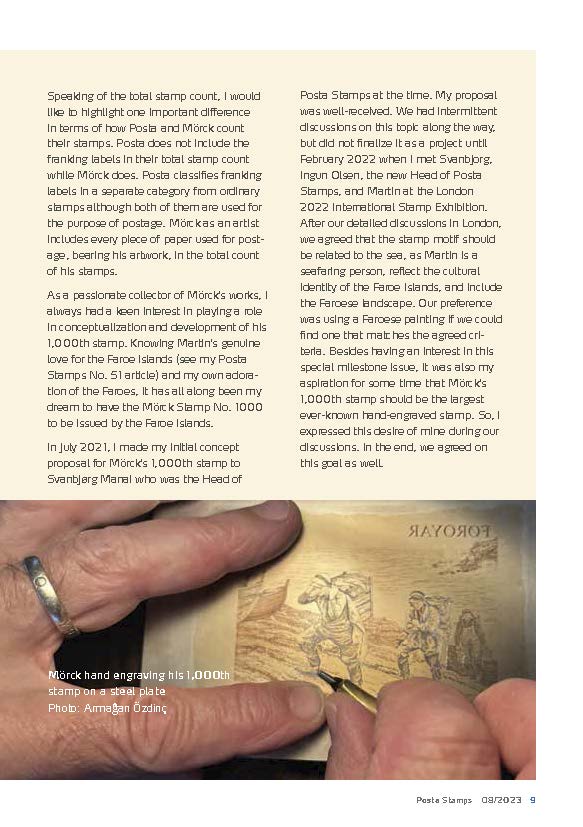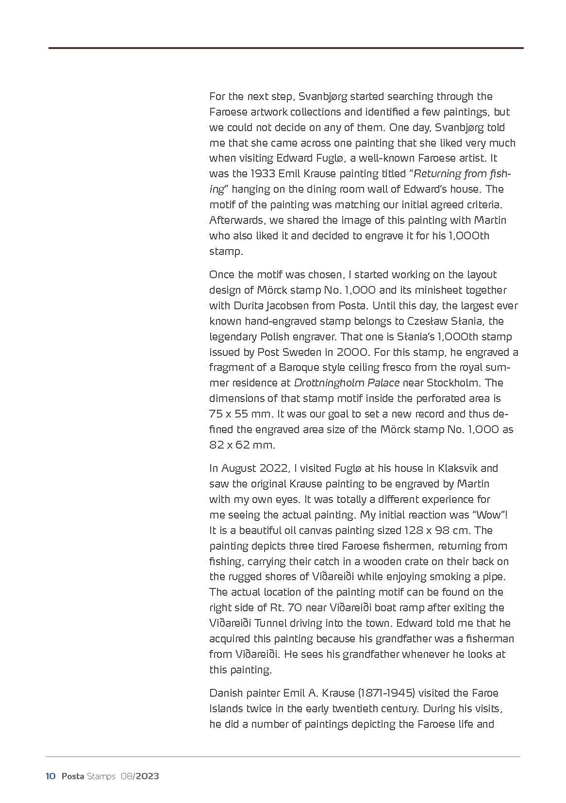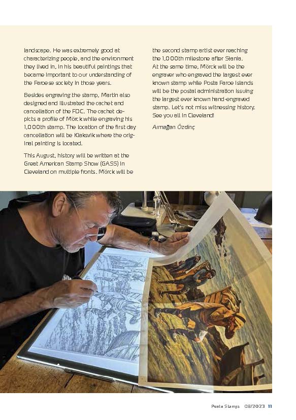 Para complementar este sello de Mörck, pongo también las 4 páginas que le dedicó la revista oficial de sellos de Islas Feroe, donde se dice que entre esos mil sellos se incluyen también los sólo diseñados, aunque estos son muy pocos en comparación con los grabados. Dos de las imágenes son un poco pequeñas, pero se pueden leer ampliándolas un poco. En la última de estas cuatro páginas se puede ver a Mörck terminando el diseño específico de grabado para este sello tan especial, grande y a tinta, mientras que en la anterior está grabándolo a buril sobre la placa de acero original.