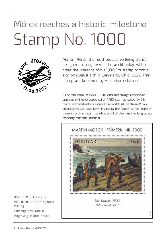 Islas Feroe emitió hace dos meses el sello número 1000 de Martin Mörck. Ha sido una excelente idea y un gran y espectacular sello, a la manera opulenta en que Suecia (2000) emitió el sello número mil de Slania.