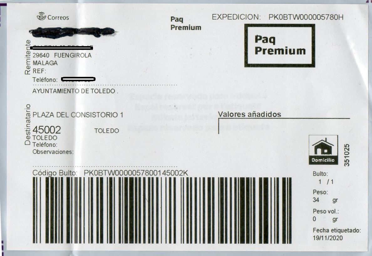 Etiqueta pre registrada por el remitente e imprimida por un empleado(351025) de Correos de Fuengirola. El producto es un Paq Premium de cuarta generación.