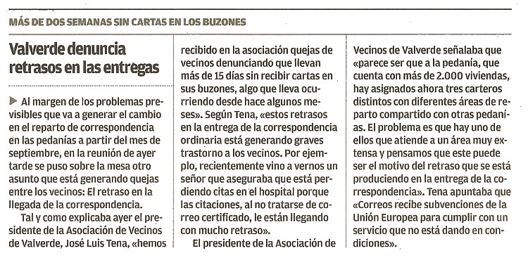 Pues mi noticia de Correos es que desde el 15 de Julio no recibo correo ordinario, el certificado llega, pero con 15 días de retraso para evitar problemas. La noticia ha salido en los medios locales. Ya sabía que esto podía suceder, en Bilbao parece que Correos quiere ahorrar.