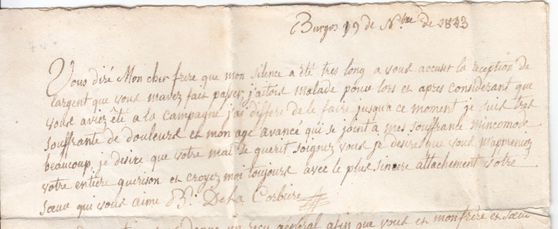 Ah, que se me olvidaba, subo ahora la parte superior del interior de la carta, con la fecha y el dorso, con fechador de tránsito por Burdeos y llegada -muy tenue- a Nantes.