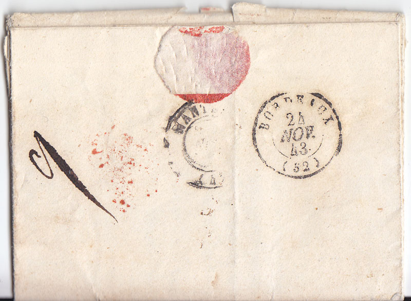 AVR86 escribió:Ah, que se me olvidaba, subo ahora la parte superior del interior de la carta, con la fecha y el dorso, con fechador de tránsito por Burdeos y llegada -muy tenue- a Nantes.