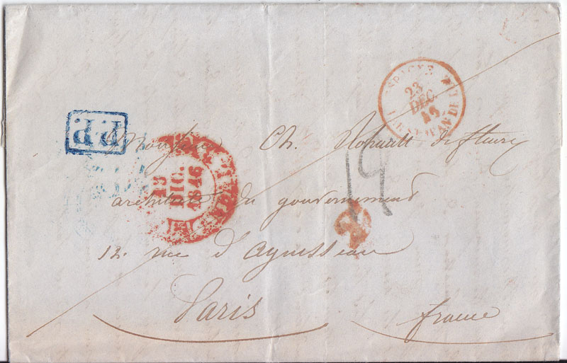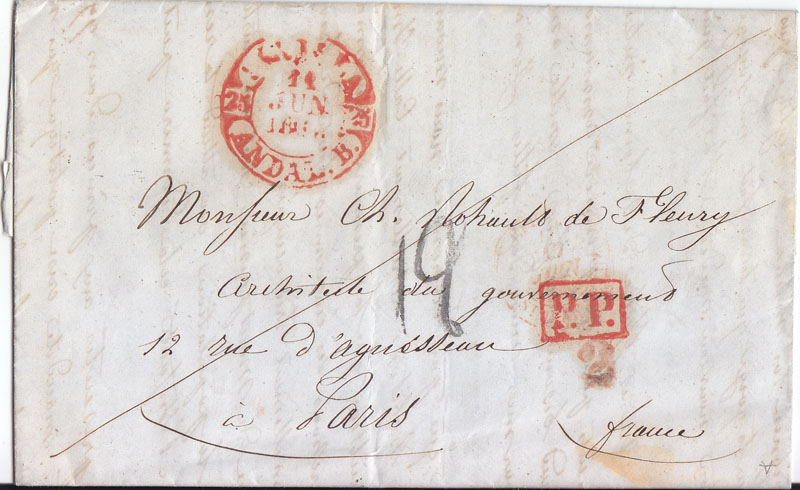 Subo una carta de Burgos a Nantes de 1843, con marca de portes pagados de dicha ciudad que adelanta la fecha de uso recogida en Tizón (nº 25)
