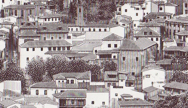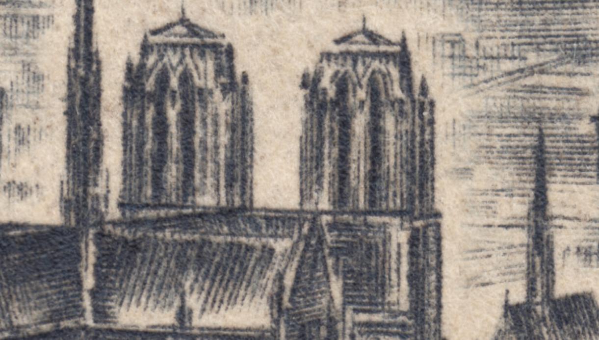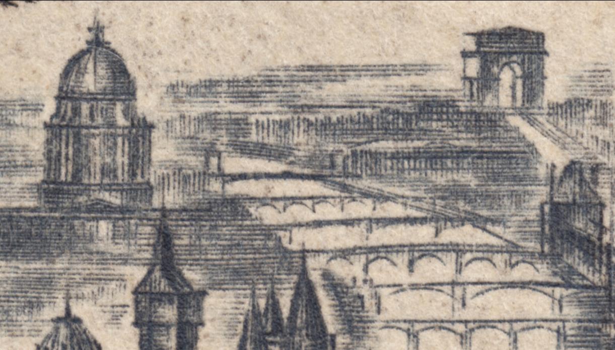 Vemos un París como a veces lo soñamos, neblinoso y romántico, triste y lluvioso. Un París difuminado y profundo en su belleza gris. Decaris grabó la vista de París, mientras que Jacques Combet grabó el marco. Una práctica poco habitual en el grabado francés, más propio del anglosajón, como bien señala Adrián en el gran blog del que hablábamos hace unos días.