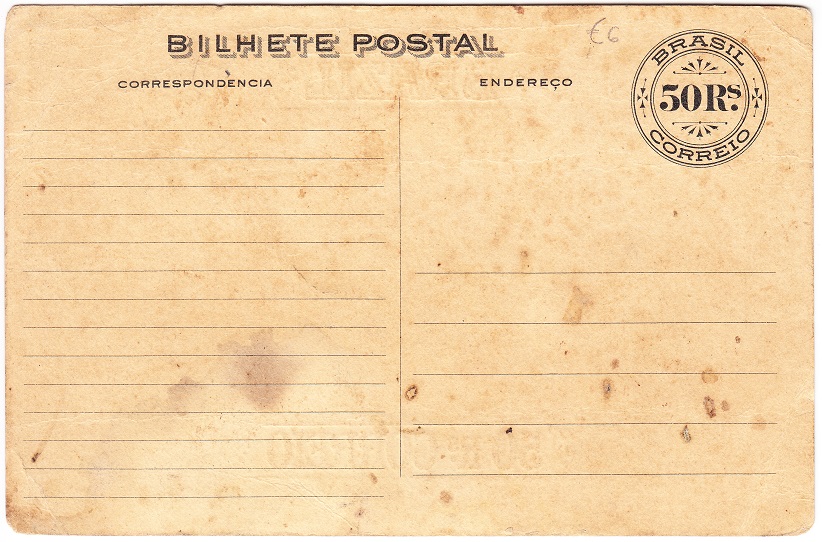 Y ahora voy al "grano". Obra en mi poder una tarjeta o "Bilhete Postal" brasileño, aunque creo que es un "Entero Postal", pues esta franqueado impreso su valor (50 Reis) al dorso.