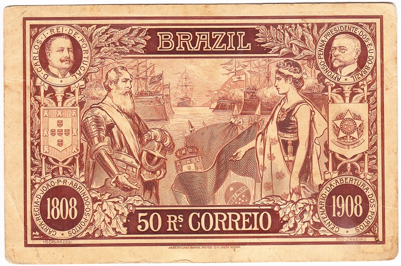 Pues bien, decir que es de 1908, pues conmemora el "Centenario de la apertura de los Puertos, 1808-1908" entre Portugal y Brasil, por lo menos eso es lo que yo interpreto y esta "GRABADO POR AMERICAN BANK NOTE CO. NEW YORK", y aunque está un poco "sufridito", es de una fineza y belleza impresionante. Espero que os guste tanto como a mí.