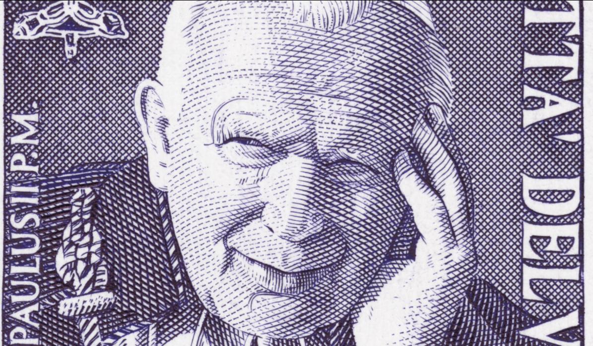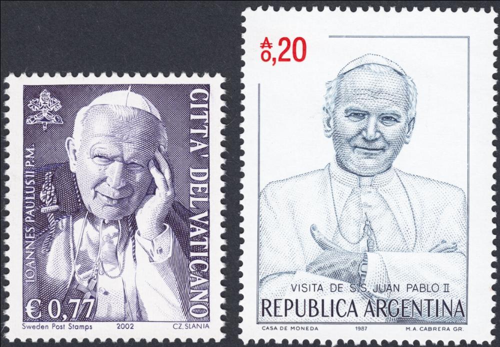 Y lo prometido es deuda. El Papa más popular en los dedos de Slania y María Adelma. Trazo más seguro y poderoso de aquél, acorde a la mayor edad que tiene en el grabado Juan Pablo II y también al momento del grabador, dueño absoluto en esos años postreros de un estilo muy definido y conseguido. Un trazo vaporoso y fino en el Juan Pablo de María Adelma para un Papa joven y vigoroso.
