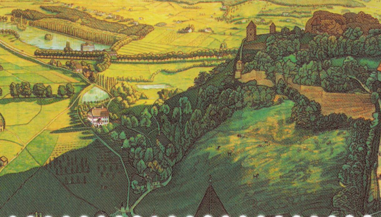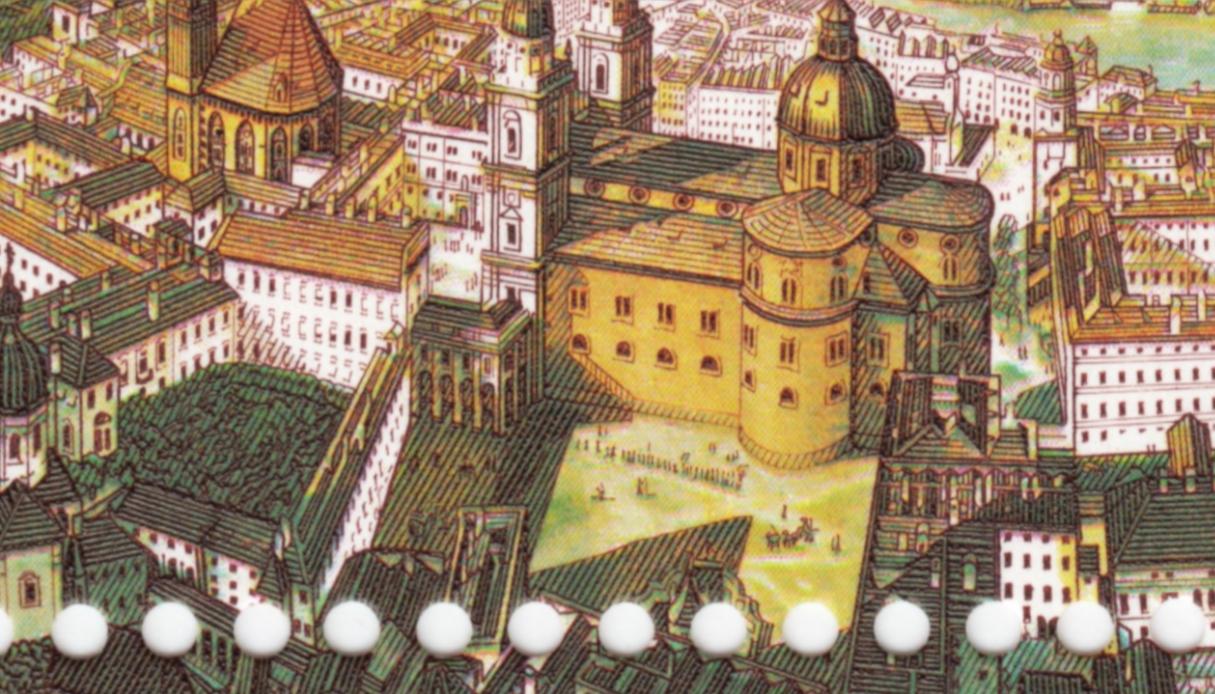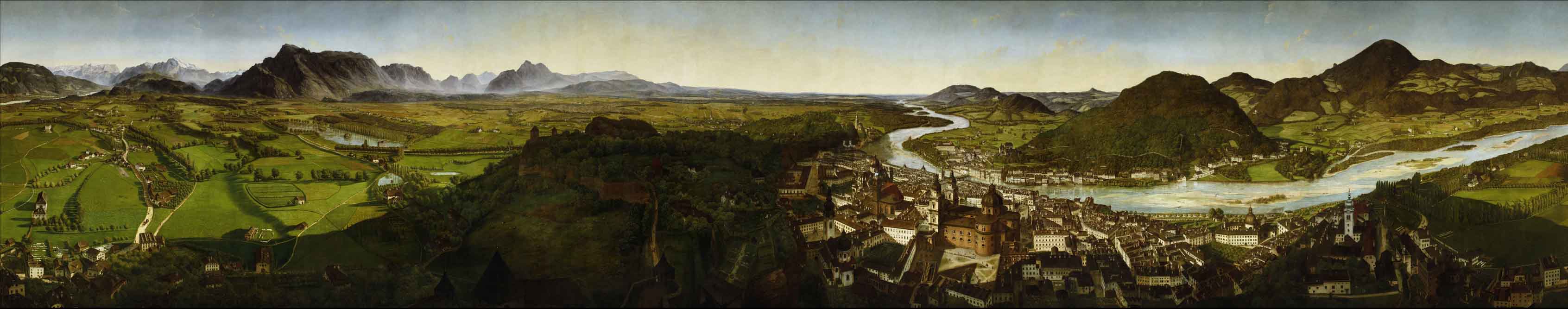 Hoja que representa la gran obra de 25 metros del artista Johann Michael Sattler, concluida en 1829. Panorama de entonces de la aún hoy bellísima ciudad de Salzburgo.