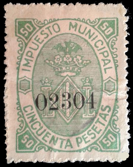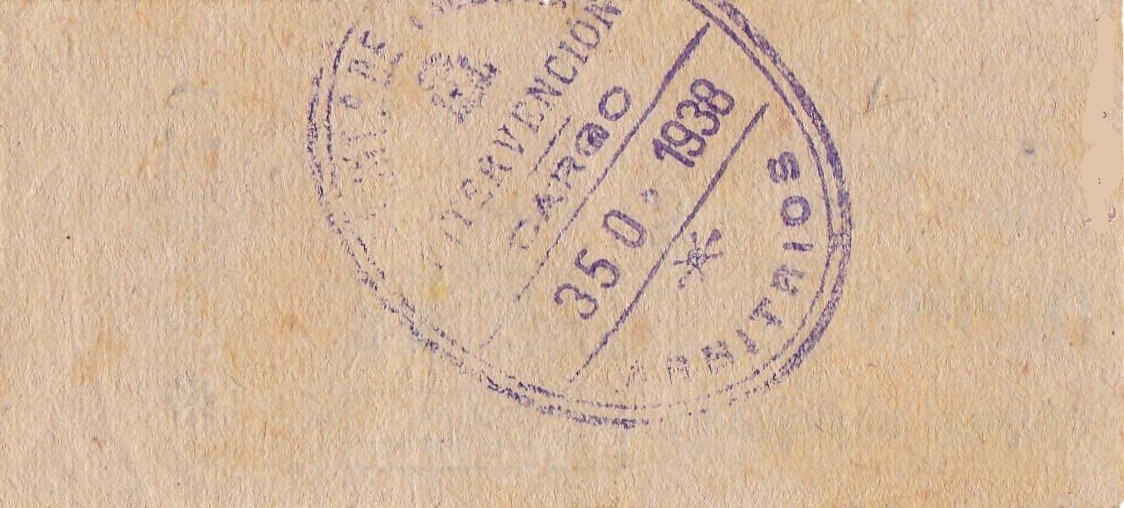 Sobrecarga en tinta violeta en forma de óvalo con los extremos girados hacia el interior. Dentro del óvalo "INTERVENCION MUNICIPAL" y año.