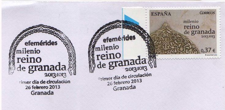 Hola, Francisco Gilabert me ha enviado esta semana un sobre y una tarjeta con el matasellos creado para la emisión dedicada al Milenario del Reino de Granada. El detalle del sello pertenece a una de las paredes del patio de los Arrayanes, se ve muy bien en la tarjeta. Muchas gracias!