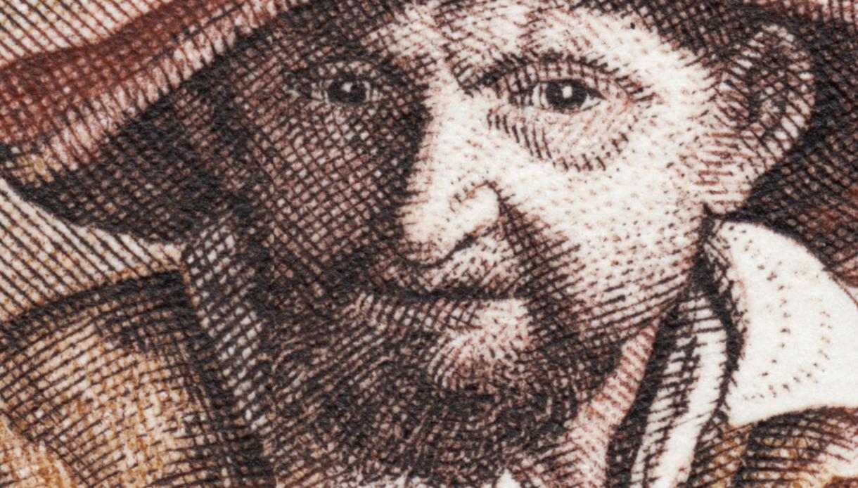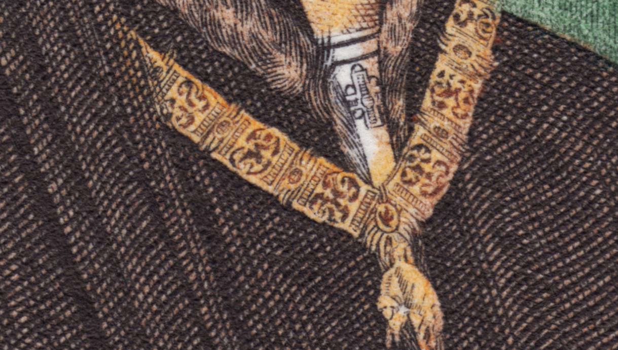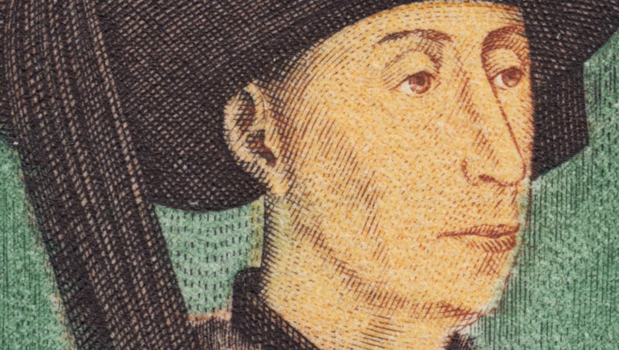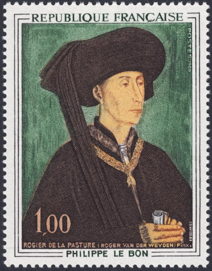 Felipe el Bueno, portando el collar de la Orden del Toisón de Oro, retratado en 1450 por Roger van der Weyden. Sin duda uno de sus retratos más logrados y conocidos. George Betemps recrea con sutileza y armonía esta gran obra y nos regala este sello soberbio: