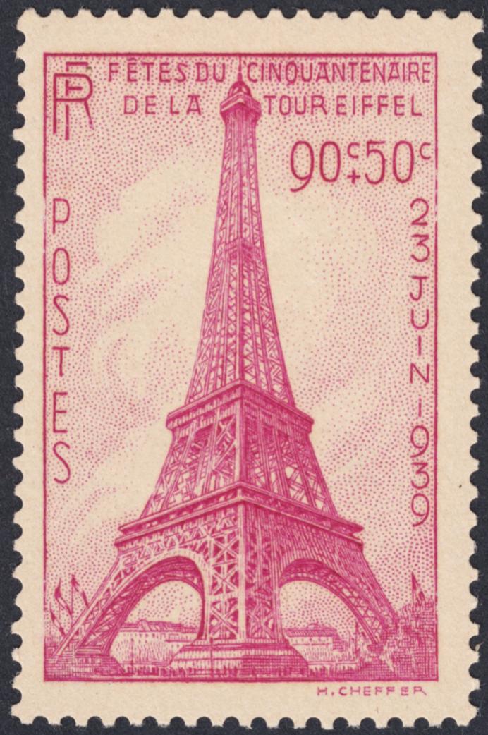Decíamos en otra página que Henry Cheffer no fue de los grabadores más relevantes en cuanto a número de sellos. Sí lo es por la calidad y la finura de los que grabó. Vayamos con tres ejemplos más. Este primero conmemora en 1939 el cincuenta aniversario de la torre más famosa del mundo: