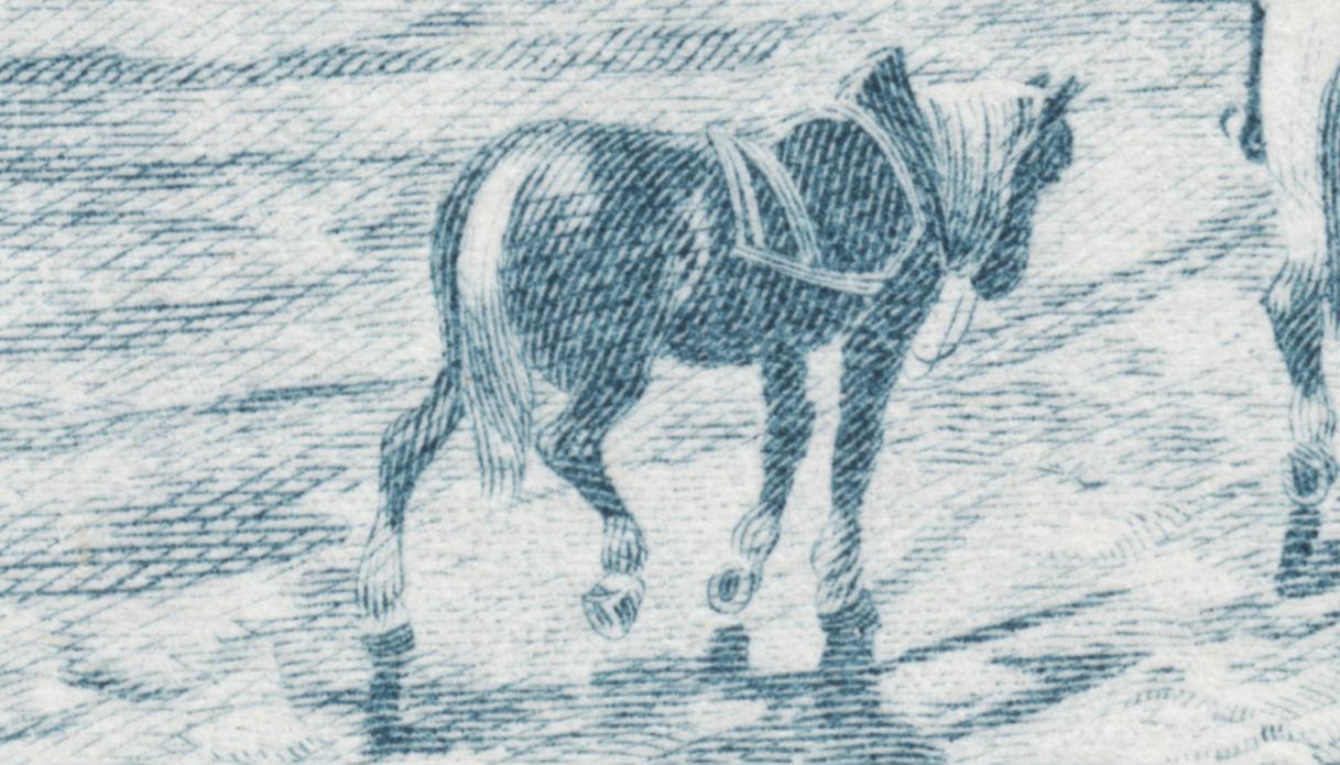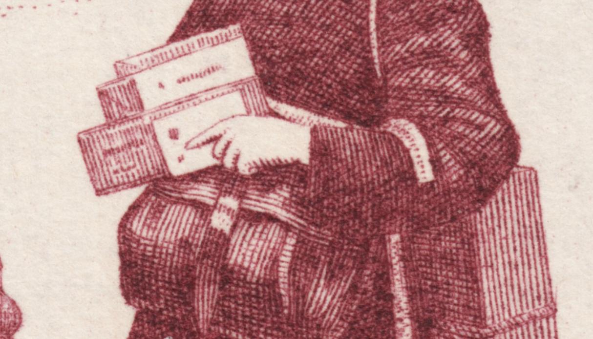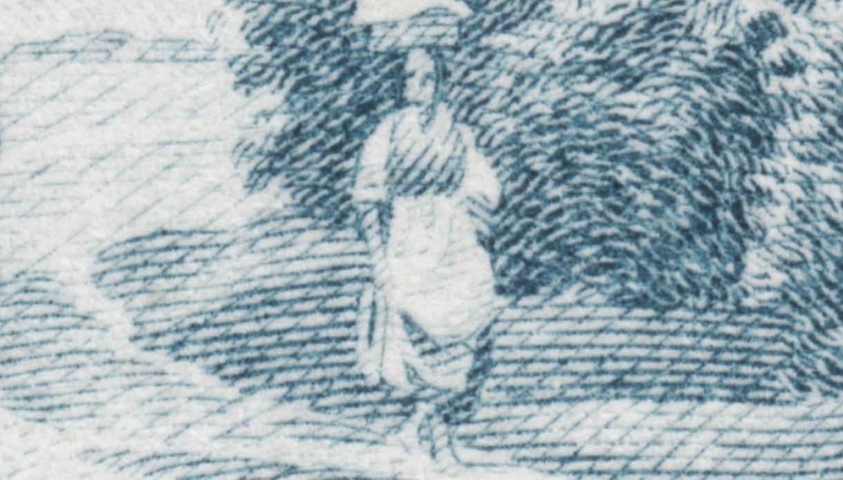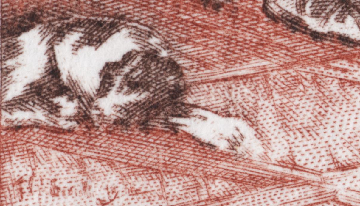 Páginas atrás mostrábamos esta prueba de máquina ya hecha sello definitivo. No nos importaba entonces la ausencia visual de la obra inspiradora, tal es su poder evocador, misterioso y profundo. Tampoco ahora es necesaria. Este sello impone su vida propia, más aún, nos entra en su ámbito de humanidad pudorosa, de palabras sugeridas, no dichas y sin embargo sentidas. Esa muchacha descalza y remangada es verano y juventud, ensoñación y anhelo de felicidad. Y a sólo unos metros, unos hombres de los que sólo vemos sus espaldas, encuentran en esa joven esbelta una promesa por la que vale la pena esforzarse. ¿O tal vez ya han vivido esos momentos de dicha y son sólo espectadores del pasado, testigos exhaustos de su propia vida?