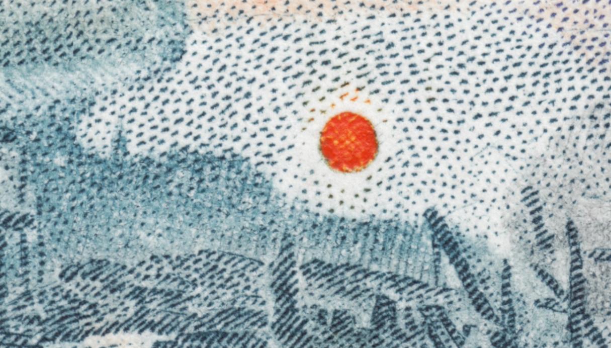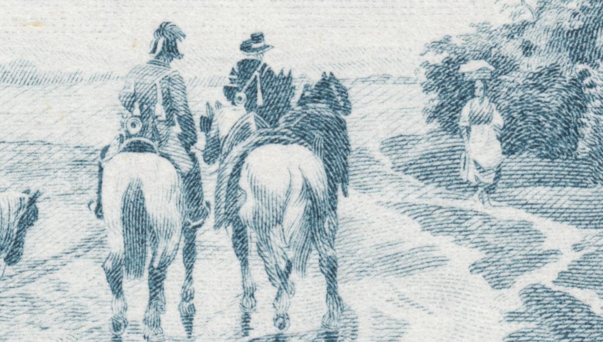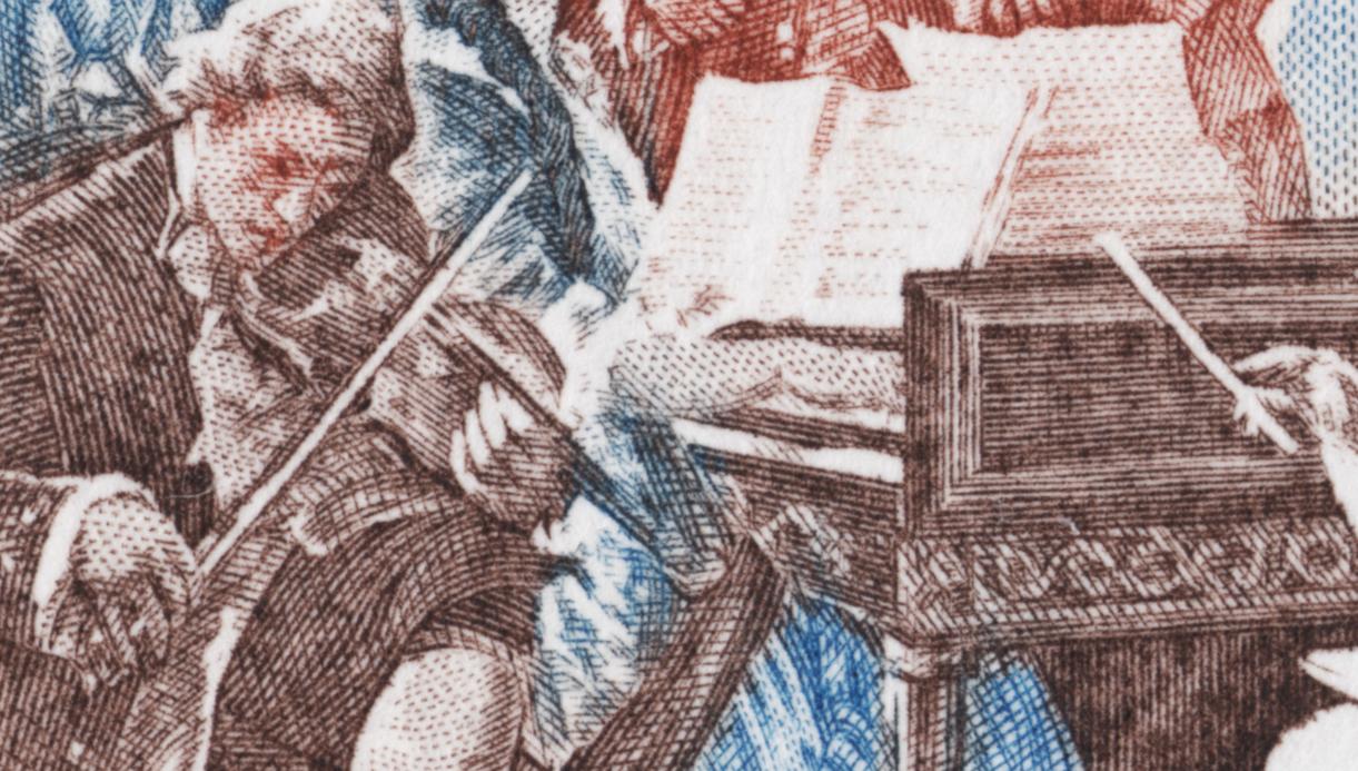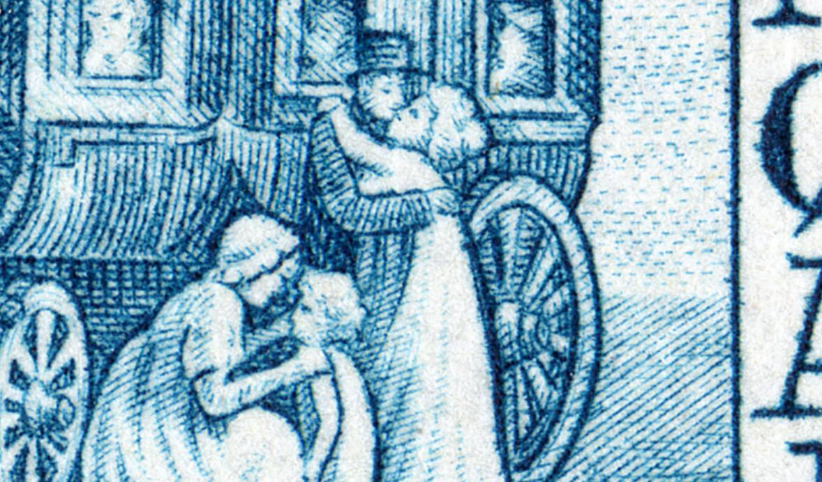 Páginas atrás mostrábamos esta prueba de máquina ya hecha sello definitivo. No nos importaba entonces la ausencia visual de la obra inspiradora, tal es su poder evocador, misterioso y profundo. Tampoco ahora es necesaria. Este sello impone su vida propia, más aún, nos entra en su ámbito de humanidad pudorosa, de palabras sugeridas, no dichas y sin embargo sentidas. Esa muchacha descalza y remangada es verano y juventud, ensoñación y anhelo de felicidad. Y a sólo unos metros, unos hombres de los que sólo vemos sus espaldas, encuentran en esa joven esbelta una promesa por la que vale la pena esforzarse. ¿O tal vez ya han vivido esos momentos de dicha y son sólo espectadores del pasado, testigos exhaustos de su propia vida?
