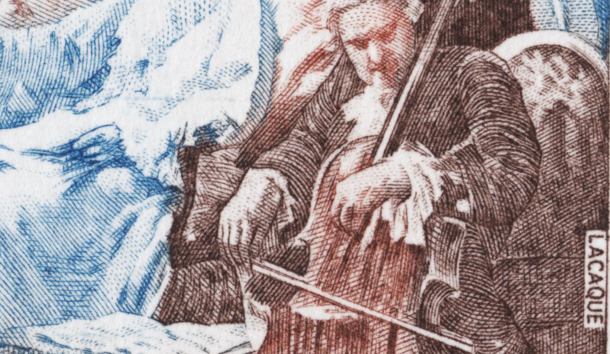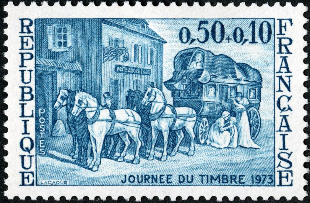 Una última aportación visual más sobre Lacaque, autor del grabado y también del diseño acuarelado de este sello conmemorativo del Día del Sello francés de 1973: