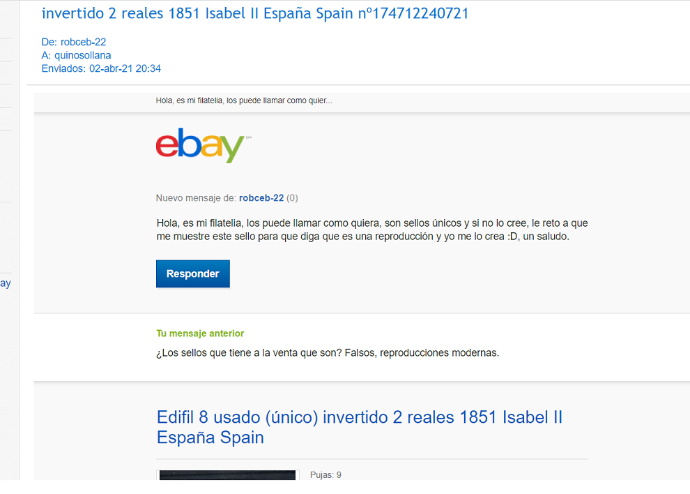 "Yo vendo mi filatelia, cada sello que tiene usted ha costado años de estudio y conocimiento por mi parte, cosa que parece que no valora por lo que veo, luego ya le he dicho que es casi original con un porcentaje alto de veracidad, no pone que sean 100% originales en ningún sitio, pero tienen su valor por lo anteriormente descrito y no es ninguna estafa,"