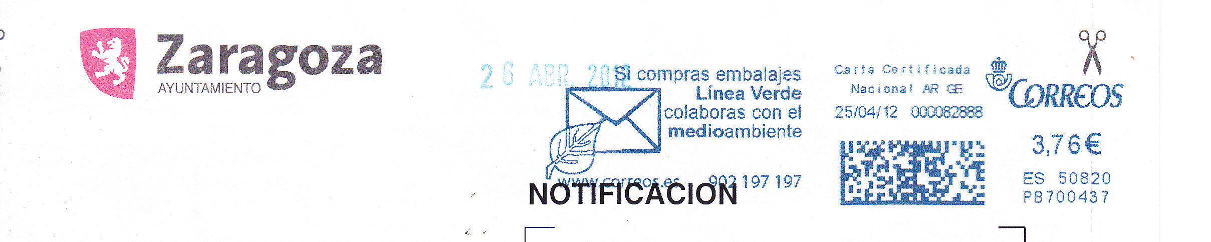 Pues éste de la máquina PB700437 del Ayuntamiento de Zaragoza, con su propaganda de Línea Verde, me ha dado la mala noticia de una multa de tráfico que me pusieron en Noviembre del año pasado en dicha ciudad, que a decir verdad estaba por entonces, y creo que aún continúa, con las calles principales levantadas con obras, y por lo visto recaudan multas a doquier, para sufragar dichas obras, sin la menor piedad.
