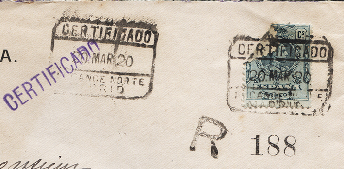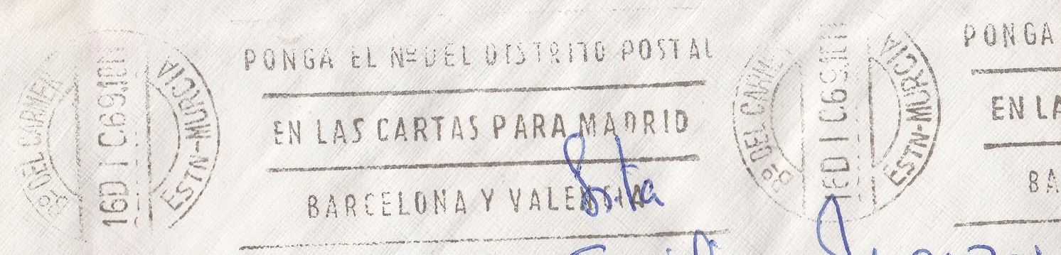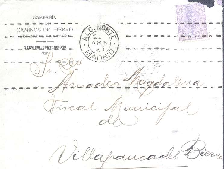 Tenía que haber mucho tráfico de mercancías en las estaciones de Madrid, que estaban dedicadas a la PV (Pequeña velocidad, es decir a las mercancías), si los lineales son ya poco corrientes sobre documentos, este fechador, sobre un envío postal es el único que he visto. ¿Alguien de vosotros puede aportar más fechadores de este tipo, o alguna otra información ?