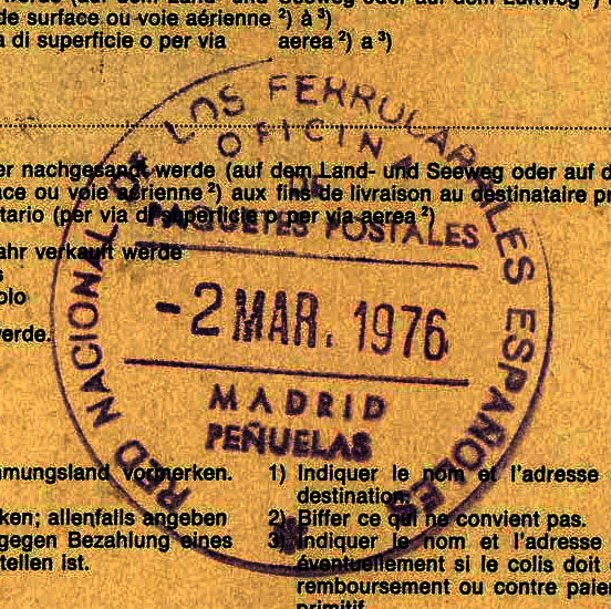 OFICINA DE PAQUETES POSTALES -2 MAR 1976 MADRID PEÑUELAS RED NACIONAL DE LOS FERROCARRILES ESPAÑOLES