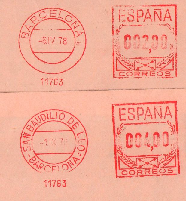 Y por último y como curiosidad, un cambio de dirección de la empresa ACUÑACIONES ESPAÑOLAS de Barcelona a SAN BAUDILIO(corrigelo, Angel) de Llobregat con una diferencia en las improntas de solo unos meses...
