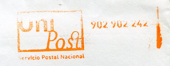 ¿Alguien me puede decir si ésto es un nuevo tipo de franqueo? Pensaba que eran unas marcas privadas, imagino que una red de Unipost propia, pero por la parte trasera del sobre lleva el código de líneas naranjas de ¿Correos?.