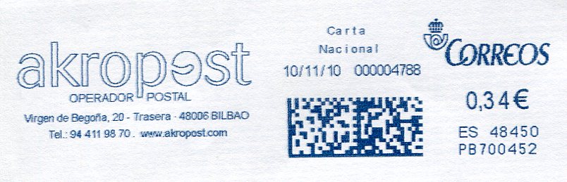 Otra: la bilbaina Akropost, esta si emplea los mismos tipos de franquedoras para cancelar sus envios, pero dependiendo de su gestión y entrega pasan por Correos o lo reparten ellos mismos. Si nos fijamos en las tres imágenes siguientes vemos las similitudes.