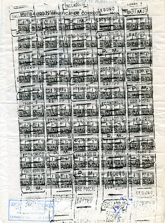 A la vuelta del documento un pliego de 100 sellos de la Mutualidad Benéfica de Correos con fechador de rodillo de Paquete Muestra de 28 ABR 73