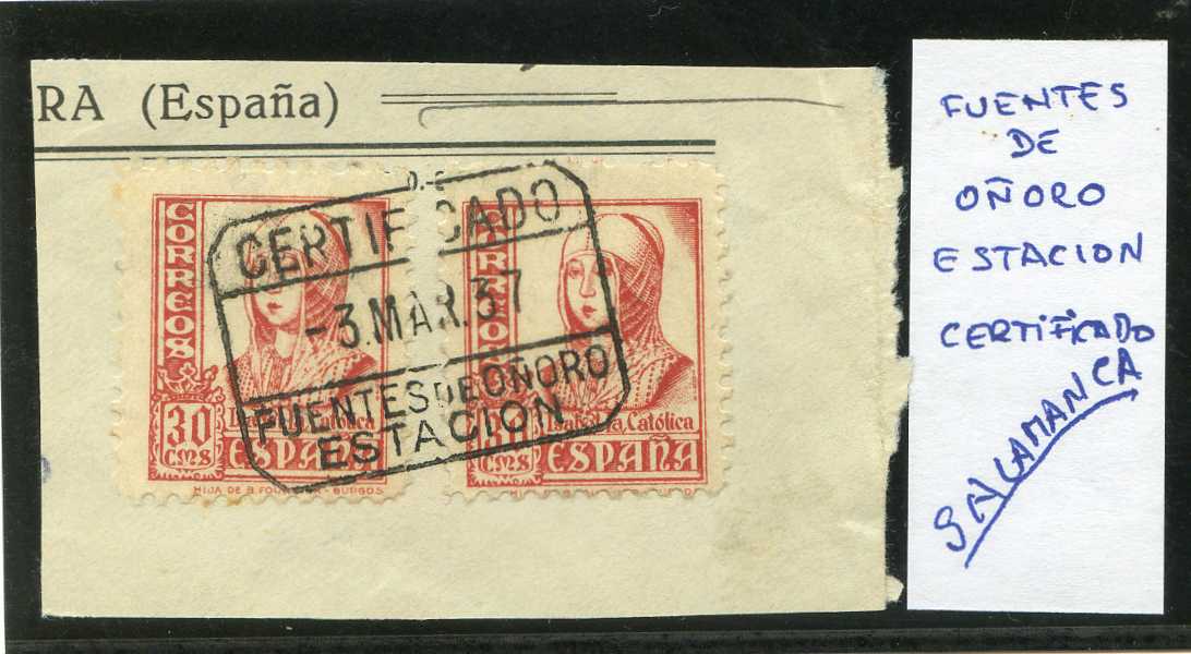 Salamanca Fuentes de Oñoro Certificado 35x25 mm Primera fecha en el catálogo 3 de marzo de 1937