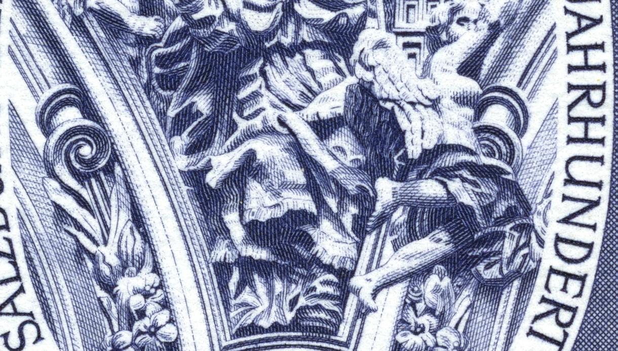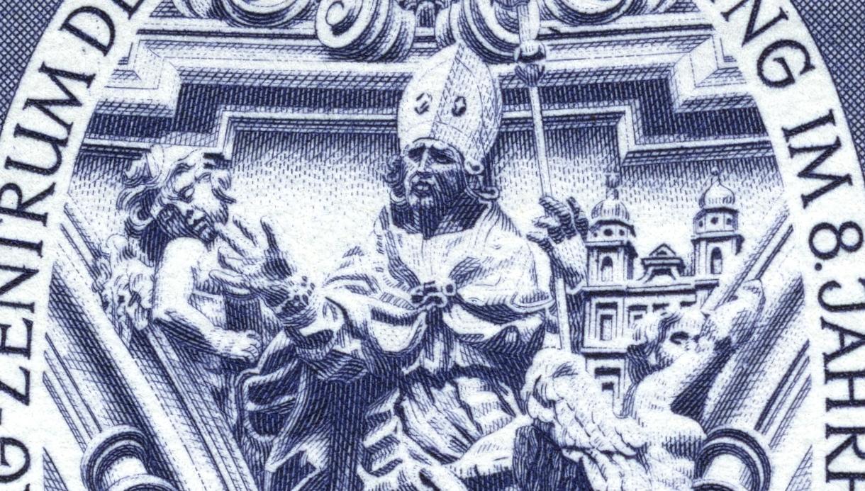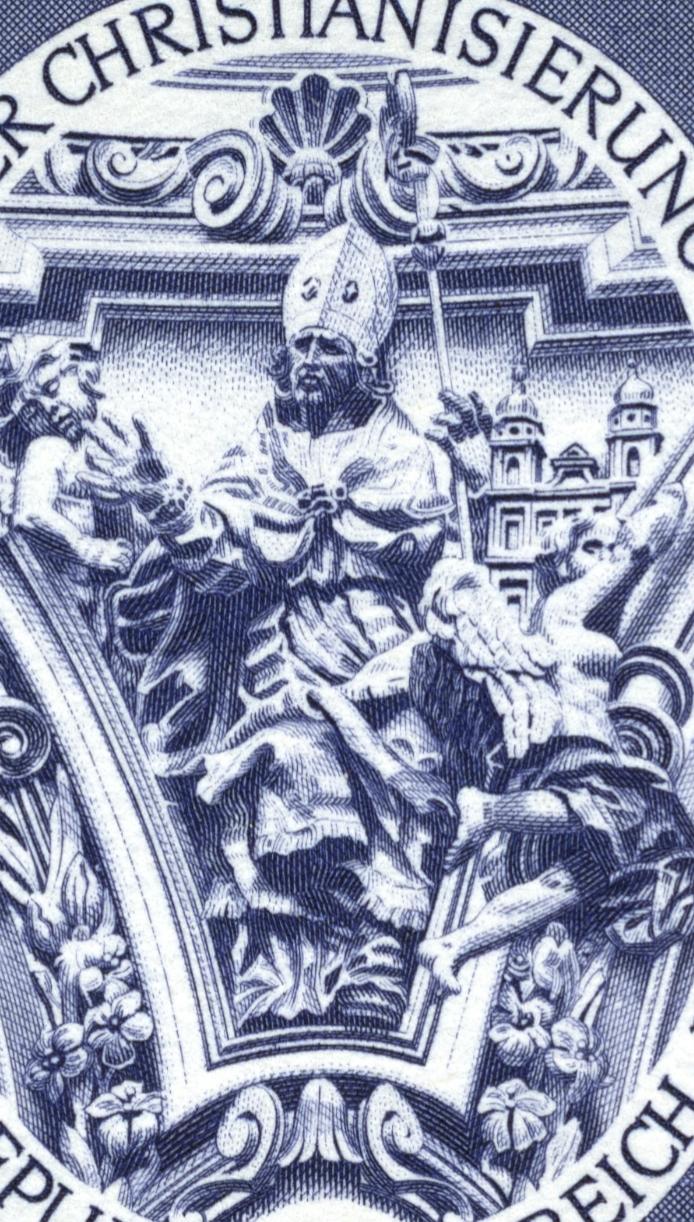 En 1974, Austria emitía un sello para homenajear a Salzburgo como centro agitador de la cristiandad de entonces y elegía como motivo la escultura de la bóveda de San Erhard dedicada a este obispo nacido en Irlanda. Rudolf Toth, en plena madurez creativa y con una pericia técnica insuperable, esculpía esta obra de arte del grabado en talla dulce. Superior. Majestuoso. ¡Inconmensurable Toth!