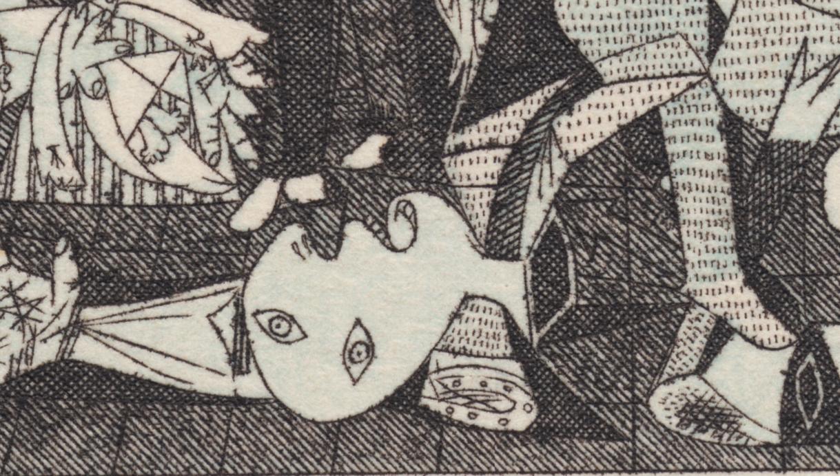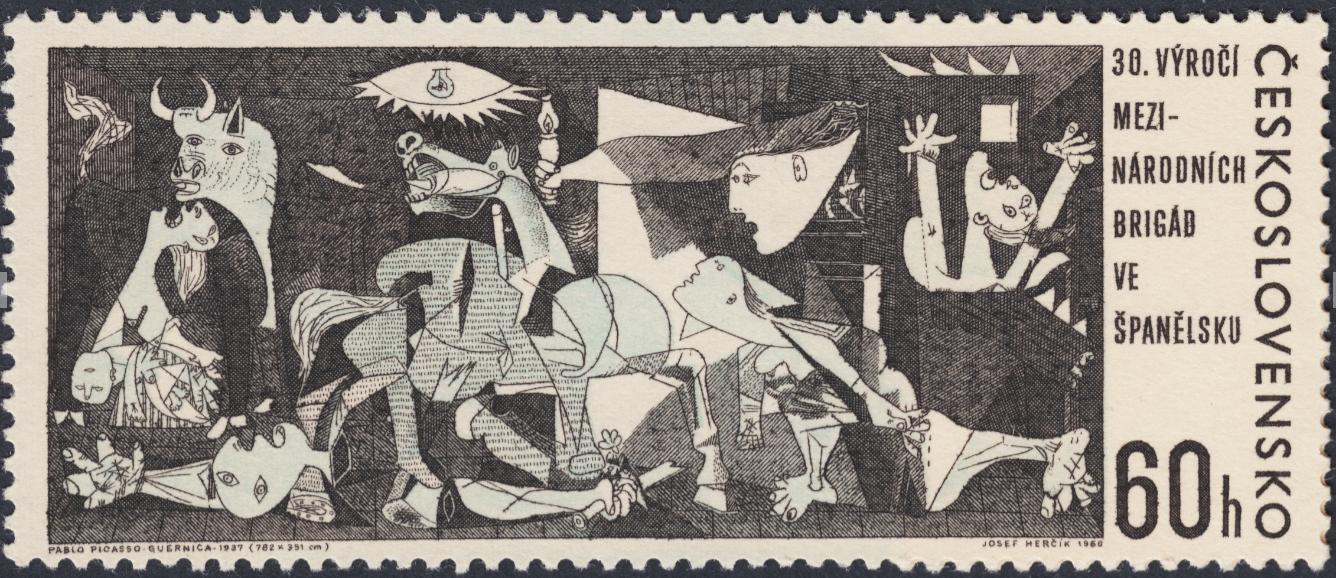 Este Guernica del grabador checo Josef Herčík, a quien presentamos aquí por vez primera, afianza esta verdad rotunda. Debajo ponemos el sello español impreso en huecograbado, que contiene la reproducción fotográfica de la obra de Picasso: es una obra de diseño y su centro es la obra original del artista malagueño, es un sello de diseñador, artístico, sí, pero contenedor de otra obra soberana, de hecho ésta es el sello. La creación del diseñador, en cuanto al sello se refiere, es marginal. En el sello de Checoslovaquia, sin embargo, acontece justo lo contrario: la creación del artista es esencial, central, preponderante, contiene en su vientre la obra de Picasso, ¡pero es un nuevo Guernica! Otro Guernica. El Guernica de Herčík, maravilloso y soberbio Guernica.