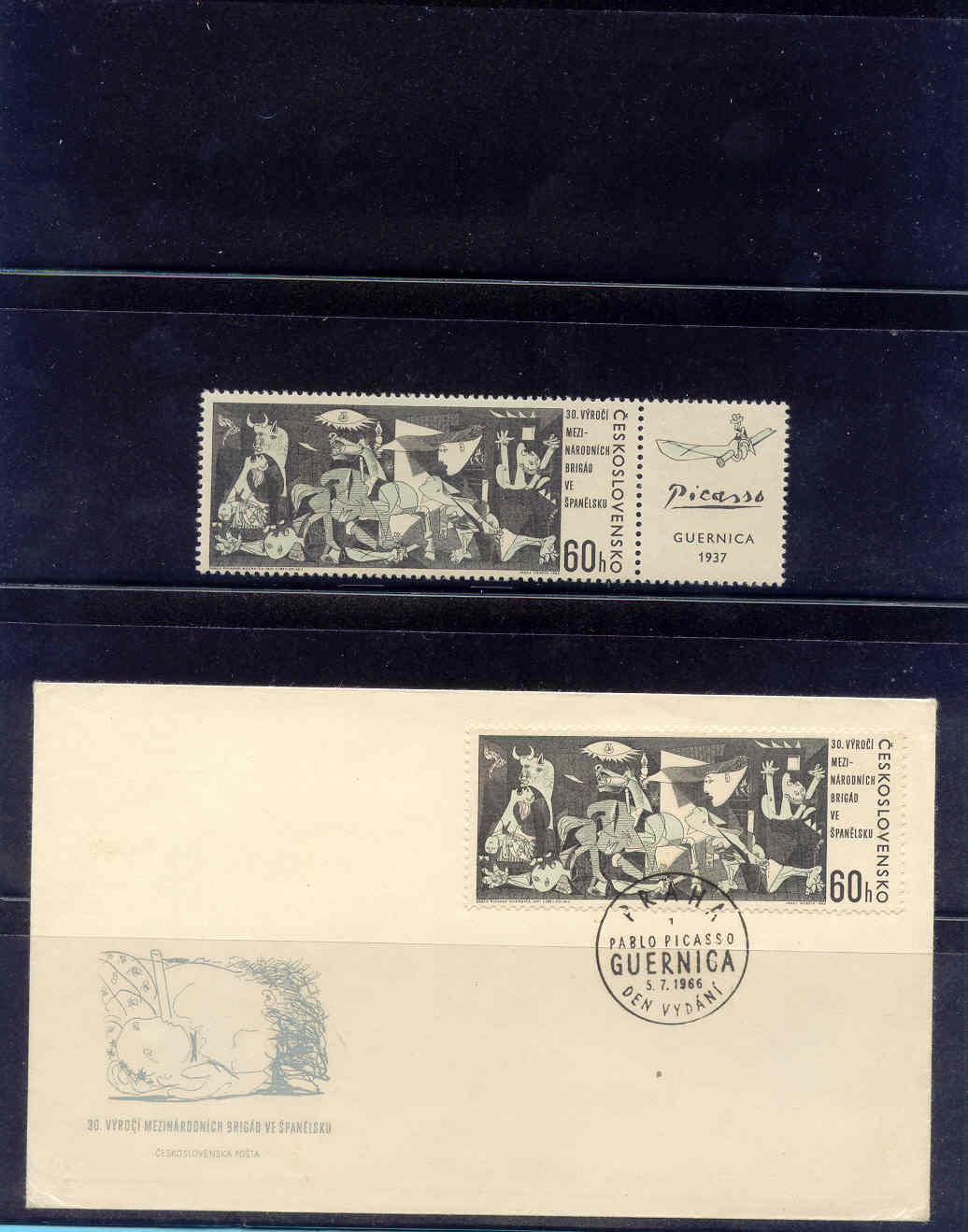 Por complementar los sellos del Amigo Ramón, y sin querer interferir en su impresionante hilo, aquí dejo ( de mi colección temática Picassiana), la hoja completa del Guernica de Picasso de Checoslovaquia del año 1966 con sus bandeletas laterales, así como sobres primer día de los dos años 1966 y 1981. Una pena no tener el escáner a 1200, solo lo tengo hasta 600.