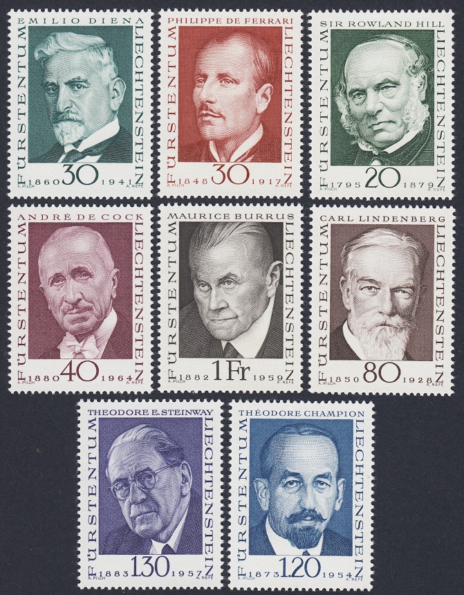 Aprovecho la entrada para mostrar imágenes de esta serie de Liechtenstein de 1968, decicada a grandes pioneros de nuestra pasión: la filatelia. Serie soberbia, impresionante demostración de pericia artística de Alfred Nefe, uno de los grandes grabadores de Austria, es decir, uno de los grandes artistas del buril del mundo.