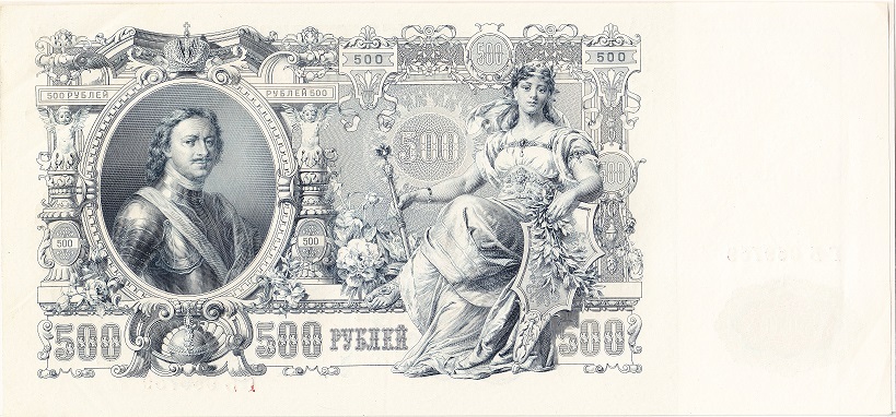 Y cambiando de terna, como se dice en el argot taurino, aquí traigo un billete de 500 rublos de 1912, con medidas 27,5 x 12,8 (mas de la mitad de un folio Din 4 en horizontal :D ), y que reproduce la efigie del Zar Pedro I.