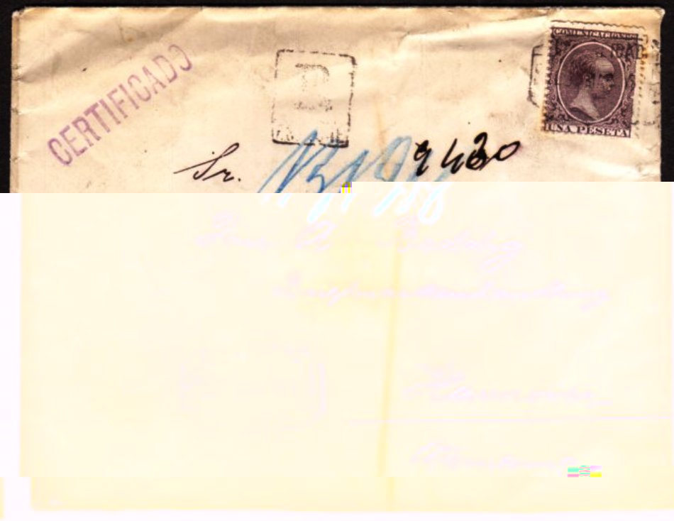 "1889 RARO SOBRE CERTIFICADO. 1889 (mar) Envío a Alemania llevando un sello de una peseta con matasello certificado, también tampón "R" y lineal "cerificado" en violeta. Todo el correo certificado tenía que ser devuelto a la oficina de correos (sin el contenido) y era públicamente destruído si el remitente no lo reclamaba (una reminiscencia de la Edad Media para comprobar que el cartero no había robado los contenidos). Por lo tanto estos envíos certificados son muy raros, conociéndose solamente 6 de este año y 322 de todo el siglo XIX (se adjunta lista)"