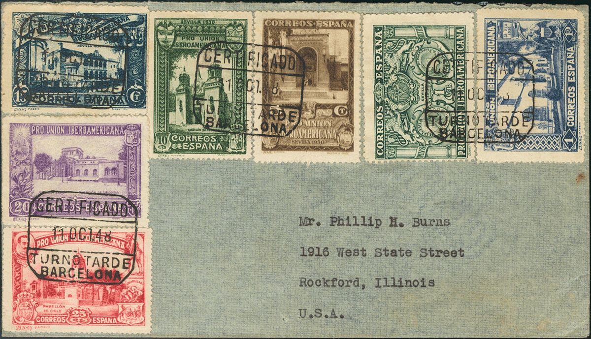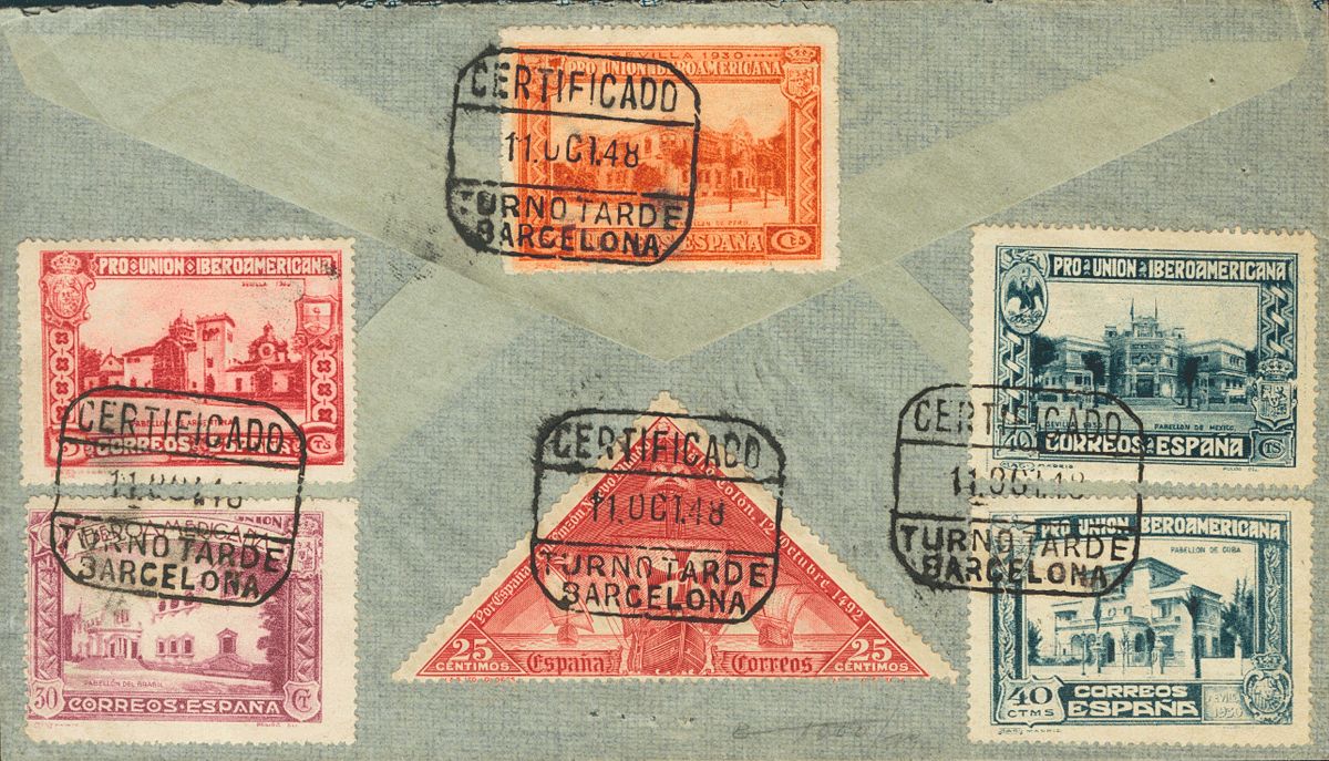 La carta está fechada en 1948, casi dos décadas después de su puesta en circulación, utilizando un matasellos de Certificados de Barcelona de manera fraudulenta. La ausencia de fechadores de llegada y/o de tránsito, así como de la numeración u otros elementos propios de los envíos certificados, revela que se trata de un montaje para el mercado filatélico que nunca llegó a circular.