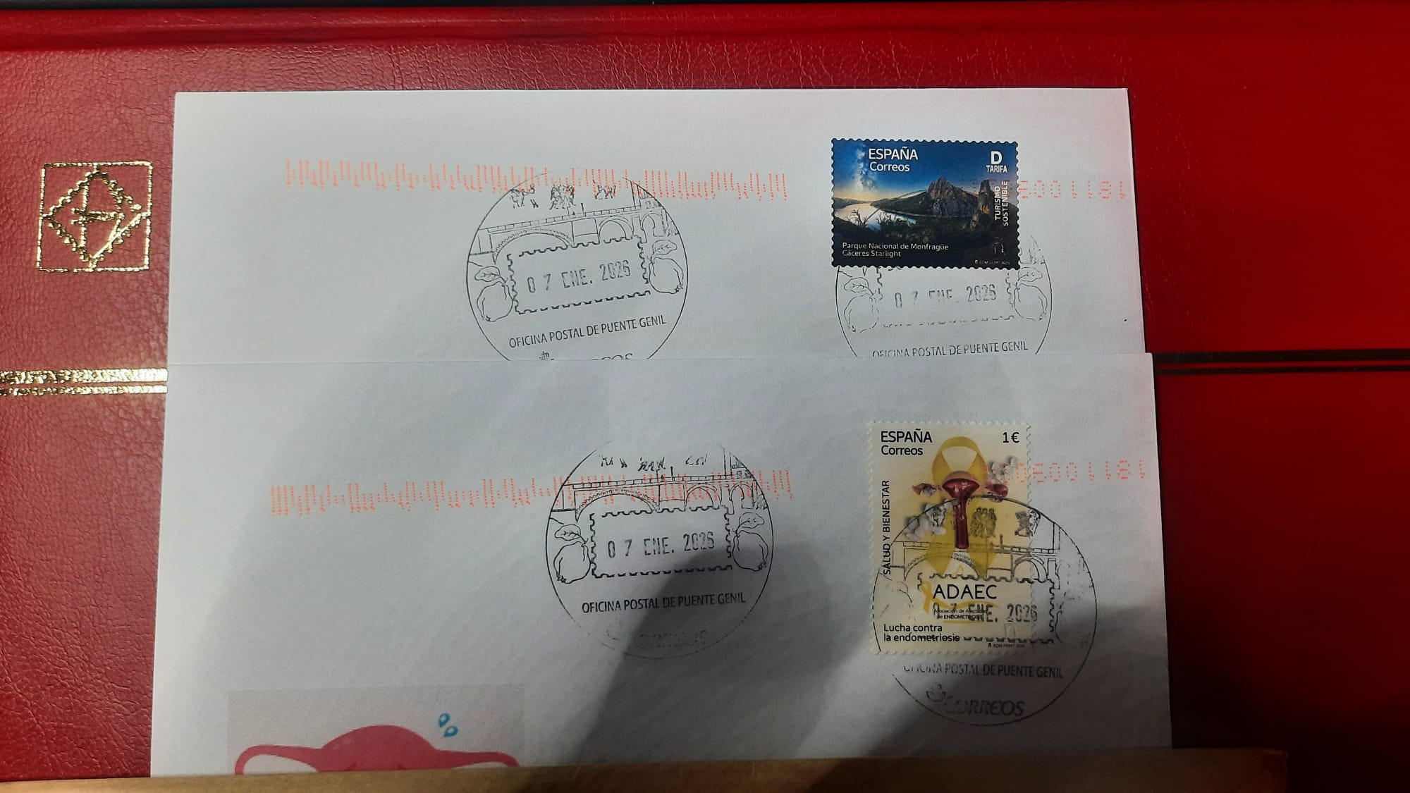 Hola, llegaron las dos de Beatriz que muestra Pepe en mensajes anteriores, con el sello del Día mundial de la Endometriosis y el Parque de Monfragüe.