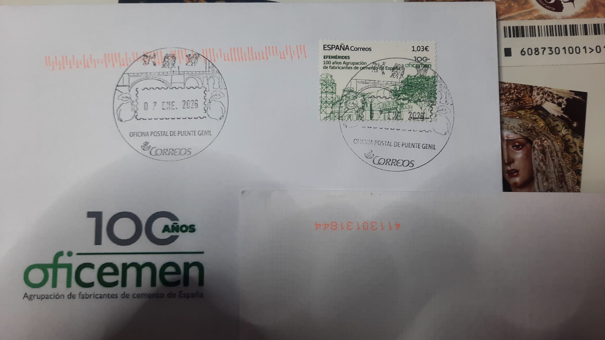 Recibidos también en Tres Cantos los dos sobres de Beatriz (Monfragüe, y 100 años fabricantes Cementos). El sello de Monfragüe le ha quedado al diseñador muy oscuro.... pero es lo que hay. Hace referencia al "mundo Starlight" que está tan de moda y por eso creo que ha elegido una composición de paisaje nocturno donde teóricamente se debería ver un cielo estrellado maravilloso... Otra cosa es que lo haya logrado (solo se percibe ese cielo muy estrellado si metemos una buena lupa o aumentamos la imagen si la estamos viendo en pantalla).