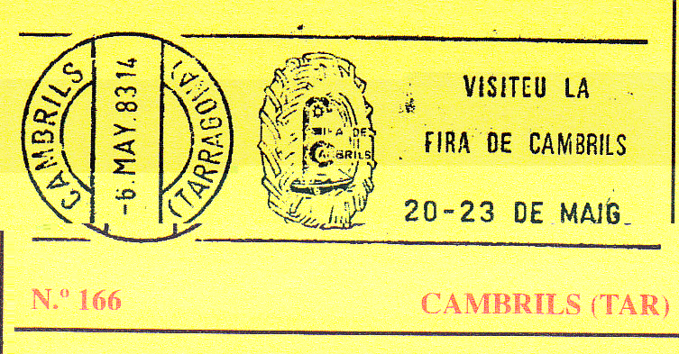 Estamos preparando la catalogación del cuaderno del año 1984 de los Matasellos de Rodillo de Correos, y tenemos unas dudas con relación al que se utilizó en esa población desde 1980 a 1983, con el texto "VISITEU LA FIRA DE CAMBRILS" del cual le adjunto imagen del utilizado en 1983. Anteriormente se utilizaba con otros textos diferentes, que por el momento no necesito datos.