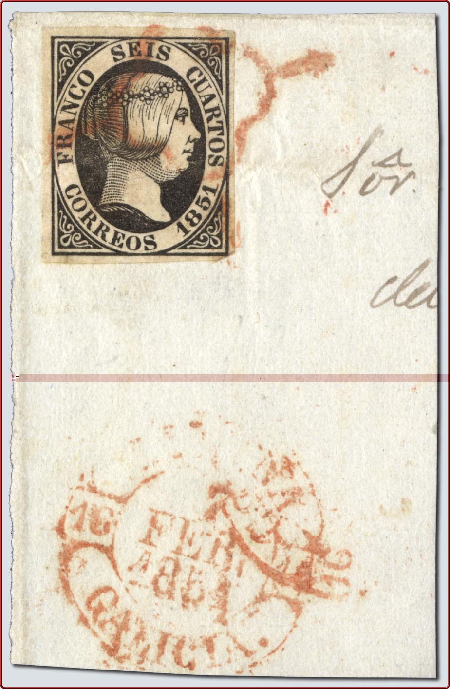 Un pedigüeño, por mísero y lastimoso, fragmentito con un #6 obliterado con matasellos araña roja de A Coruña el 7 Febrero de 1.851 ...