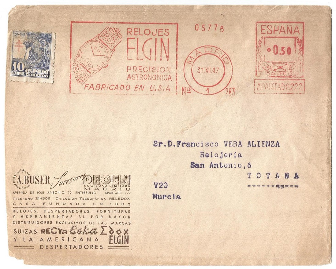 Relojes ELGIN | 31 diciembre 1947 | de Madrid a Totana (Murcia)