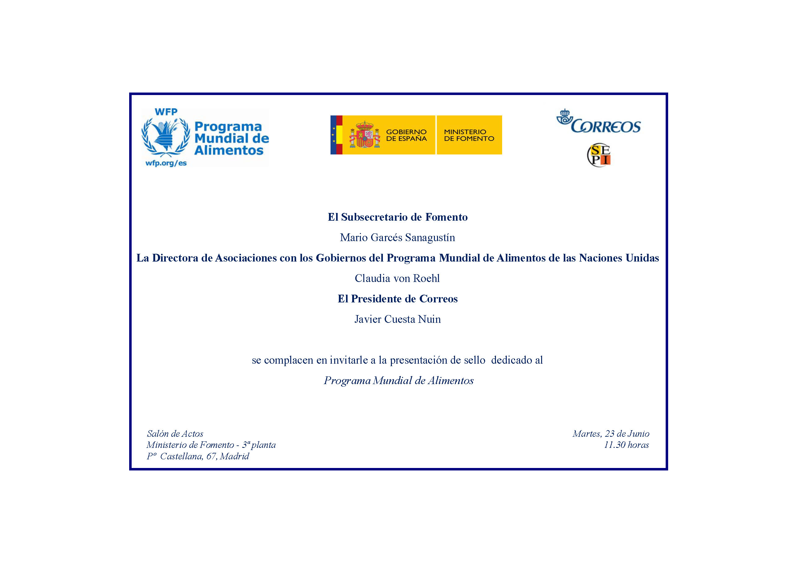 Reproduzco la invitación que, en este sentido, han cursado el Subsecretario de Fomento, Mario Garcés Sanagustín; la Directora de Asociaciones con los Gobiernops del programa Mundial de Alimentos de las Naciones Unidas, Caludia von Roehl; y el Presidente de Correos, Javier Cuesta Nuin.