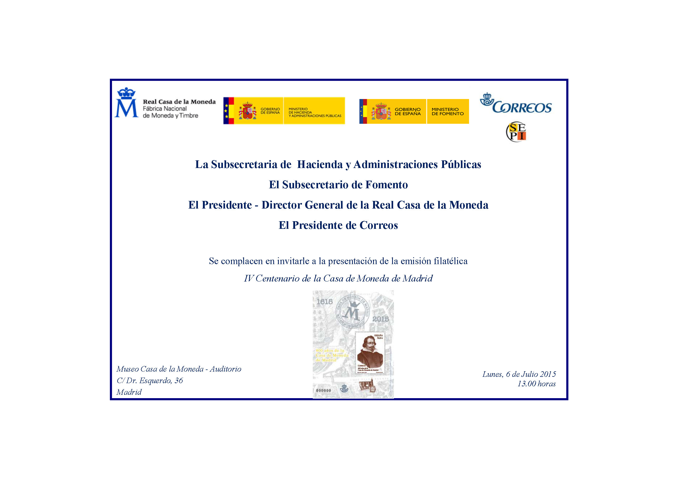 Reproduzco la invitación que, en este sentido, han cursado la Subsecretaria de Hacienda y Administraciones Públicas, el Subsecretario de Fomento, el Presidente-Director General de las Real Casa de la Moneda, y el Presidente de Correos.