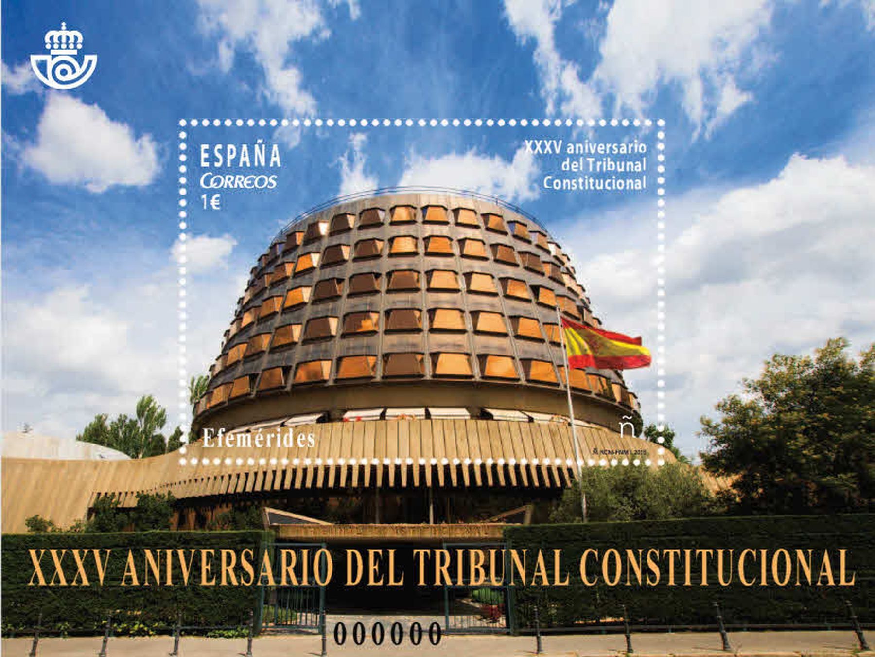 Dentro de la serie denominada «Efemérides», Dios mediante, el día 23 de julio de 2015 se emitirá una hoja bloque conmemorativa del «XXXV aniversario del Tribunal Constitucional», intérprete supremo de la Constitución, independiente de los demás órganos constitucionales del Estado. La hoja bloque, que consta de un sello de correo, reproduce una imagen del edificio del Tribunal Constitucional.
