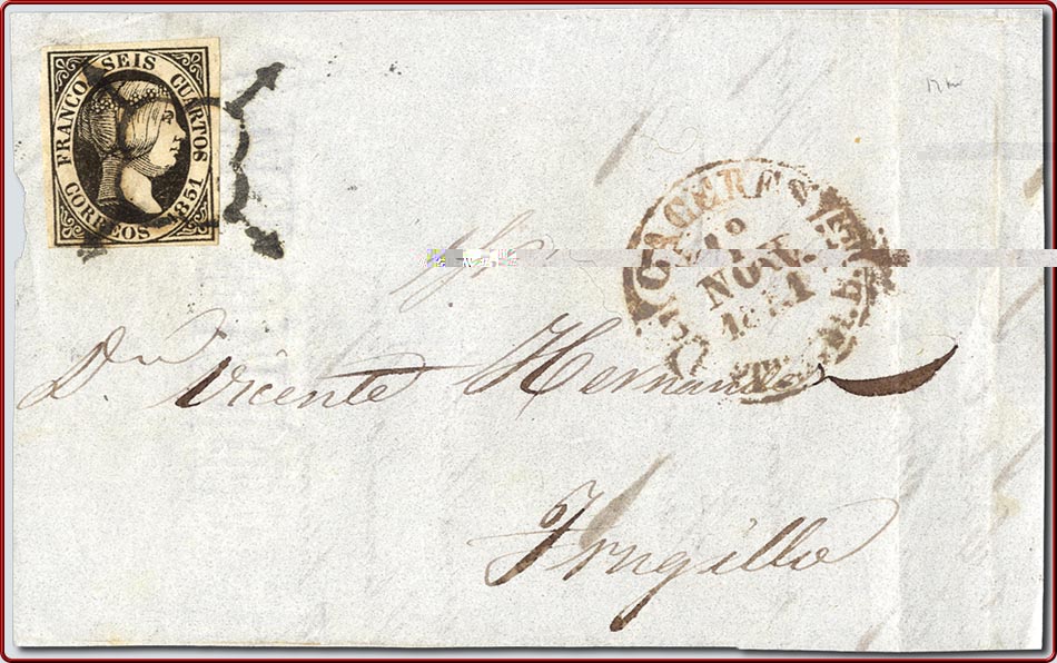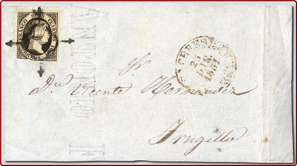 Frontal del 6 de Junio de 1.851 dirigido a Trujillo (todos están dirigidos a esta ciudad) con el Baeza de Cáceres en rojo ...